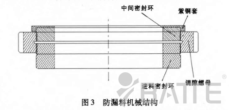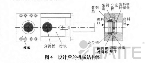 其中調隙螺母內部螺紋分左螺紋和右螺紋,和進料密封環聯接的是左螺紋,和中間密封環聯接的是右螺紋。當調隙螺母順時針放置時,進料密封環和中間密封環將向兩側移動,為提高兩側的密封性,分別在進料密封外端處加紫銅墊,在中間密封環外端加紫銅套,由于紫銅比較軟,在對調隙螺母使壓的情況下,能更好地起到密封的作用。同時,為防止在調隙螺母旋轉時進料密封環和中間密封環發生同步旋轉或扭曲,特加入兩根定位銷,定位銷貫穿進料密封環和中間密封環,兩端分別與進料密封銅環放置槽銷孔和滑板上的銷槽相聯接。整體結構如圖4所示。另外,紫銅的膨脹系數較高,在受高溫情況下會產生熱膨脹,這樣能夠進一步改善密封效果,從而使漏料問題得到很好的解決。換網器廠家:www.cnantou.com